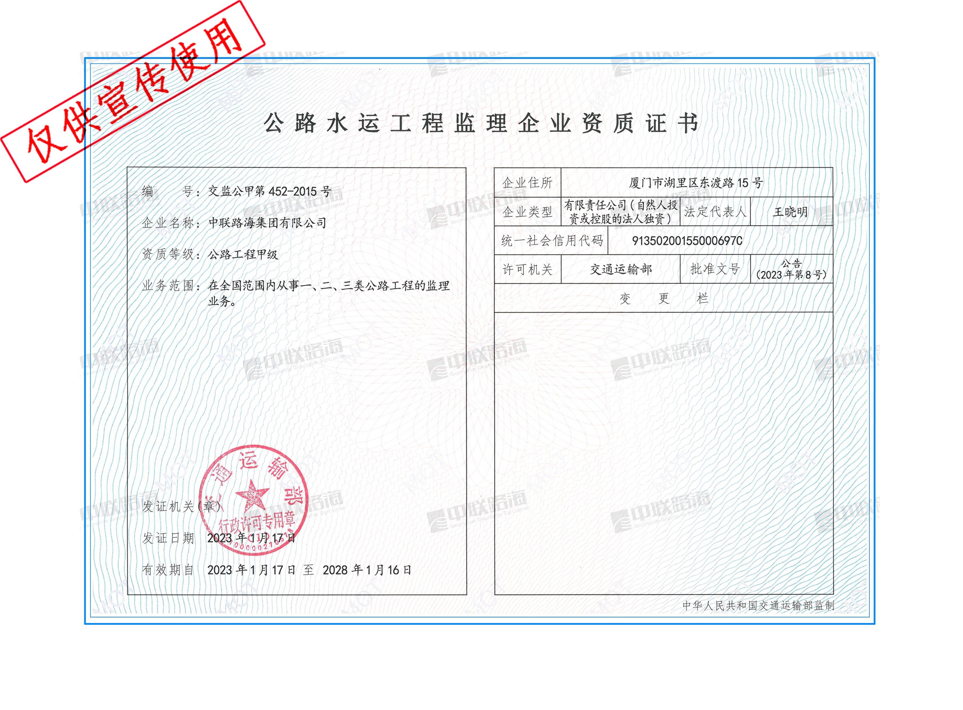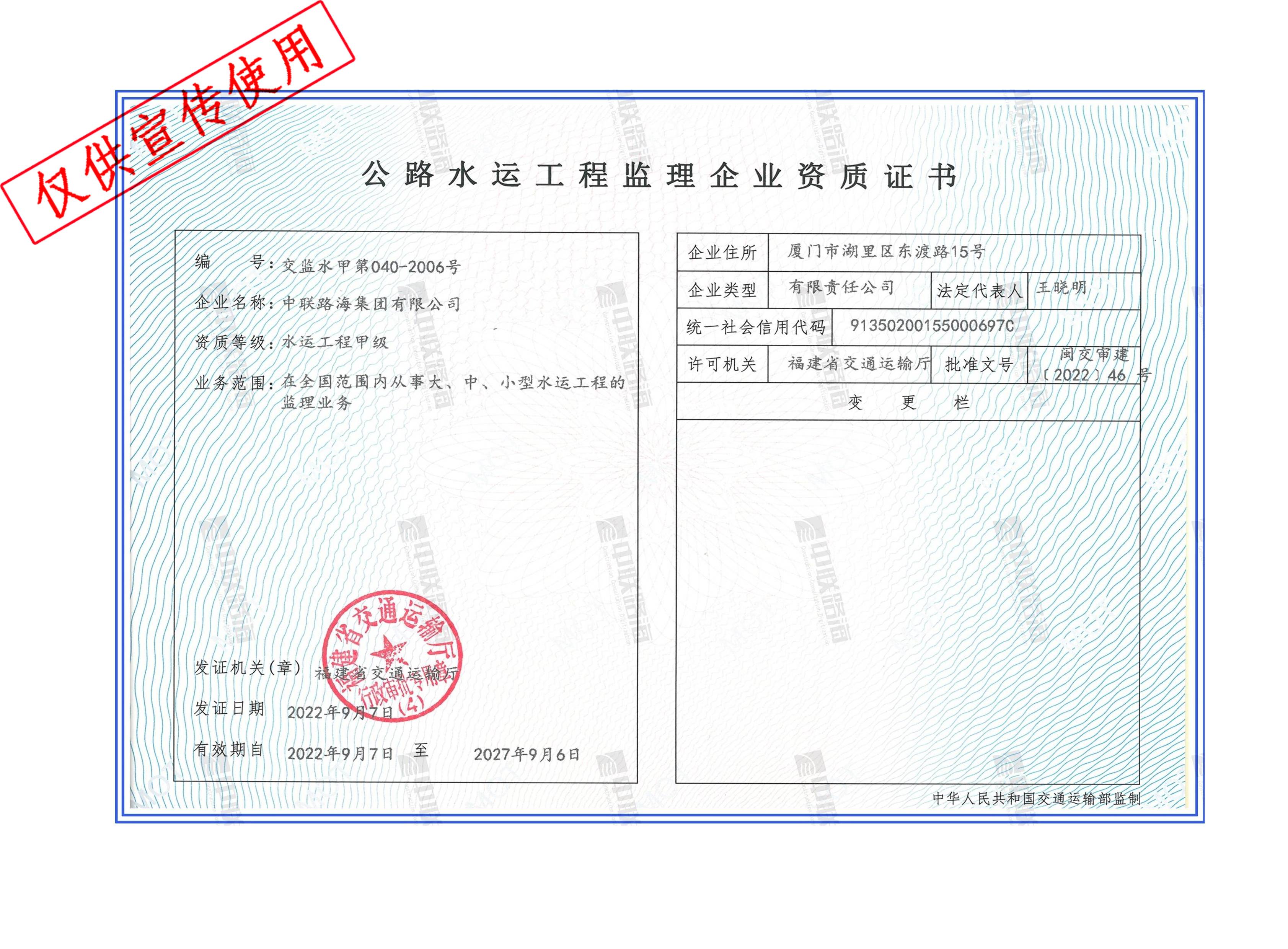 交通建设工程监理企业-水运工程甲级资质证书
