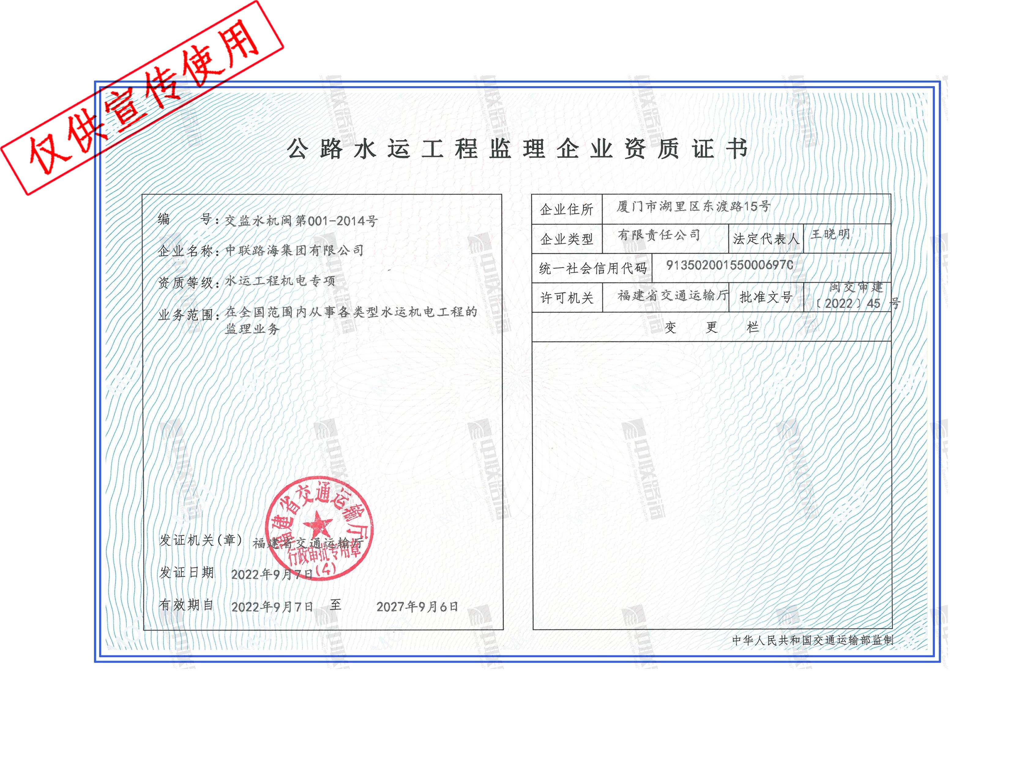 交通建设工程监理企业-水运工程监理机电专项资质证书