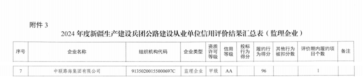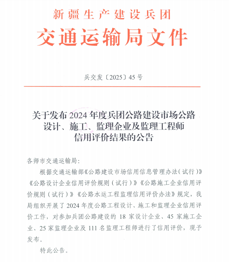近日,,新疆生产建设兵团交通运输局正式公布2024年度公路建设市场信用评价结果,,,尊龙时凯集团有限公司凭借卓越的综合实力和良好的市场信誉,,,,成功获评最高信用评价“AA”级。。这是继公司在多个省份获得AA级评价后,,在西北地区市场信用体系建设中取得的又一重要成果。。。