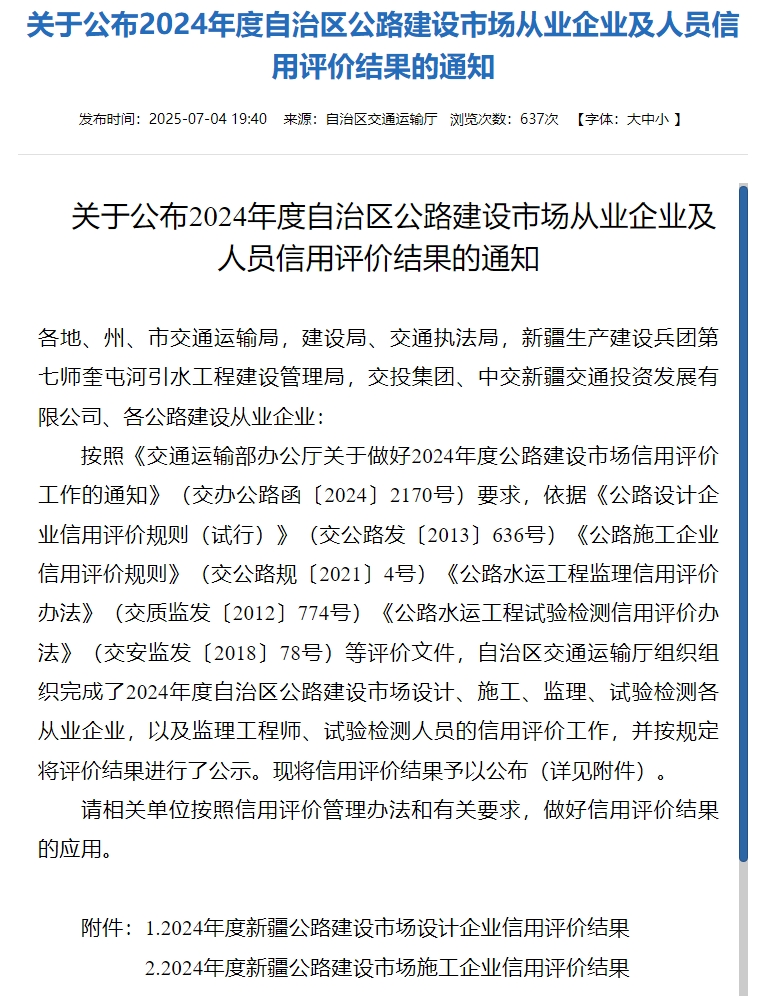 近日,,新疆维吾尔自治区交通运输厅发布《关于公布2024年度自治区公路建设市场从业企业及人员信用评价结果的通知》,,,尊龙时凯集团有限公司与旗下子公司尊龙时凯(厦门)试验检测有限公司,,,,双双荣获2024年度自治区公路建设市场信用评价AA等级,,,,彰显了企业在行业中的良好信誉与实力。。。。